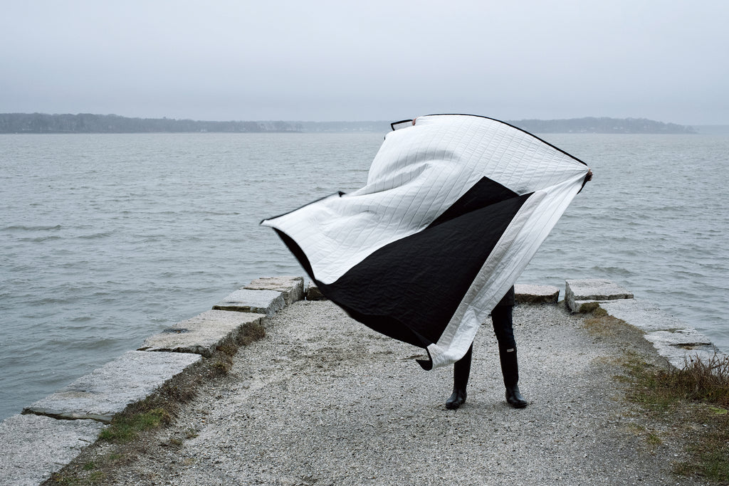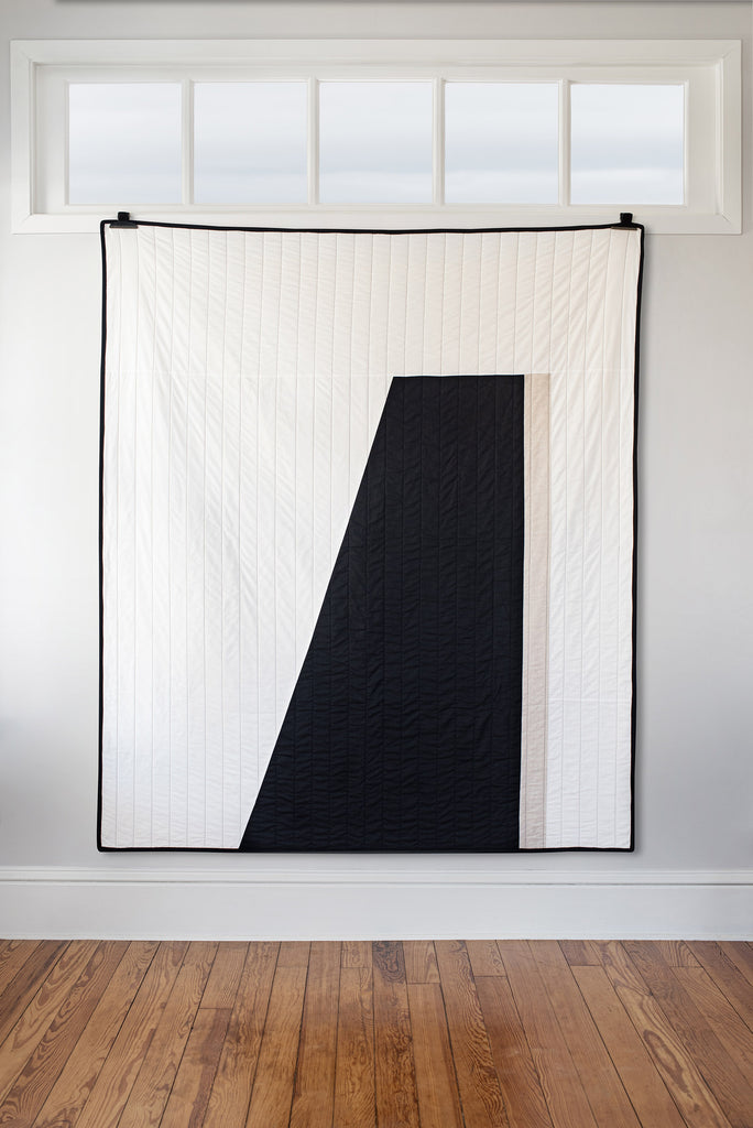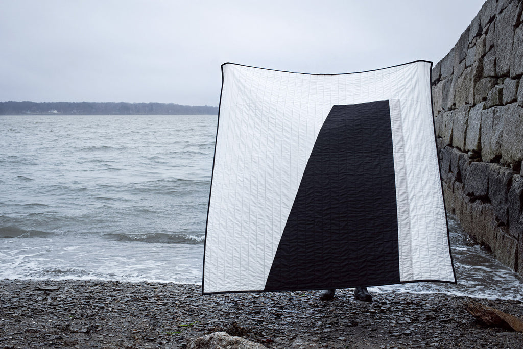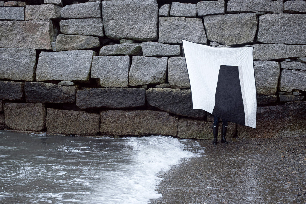 On a small island, a lovely walking trail encircles the rocky coastline. Along this path are beaches, fields, graveyards and even fairy villages. But nothing is more prominent than the stone pier. Walking to the end evokes feelings of strength and freedom, mere steps from the everyday. A place I like to pause, catch my breath and experience the many reasons we live in Maine. Literal in design, the Mackworth quilt captures the form of the stone pier, with a minimalist yet bold colorway representing the simplicity and power of its structure.