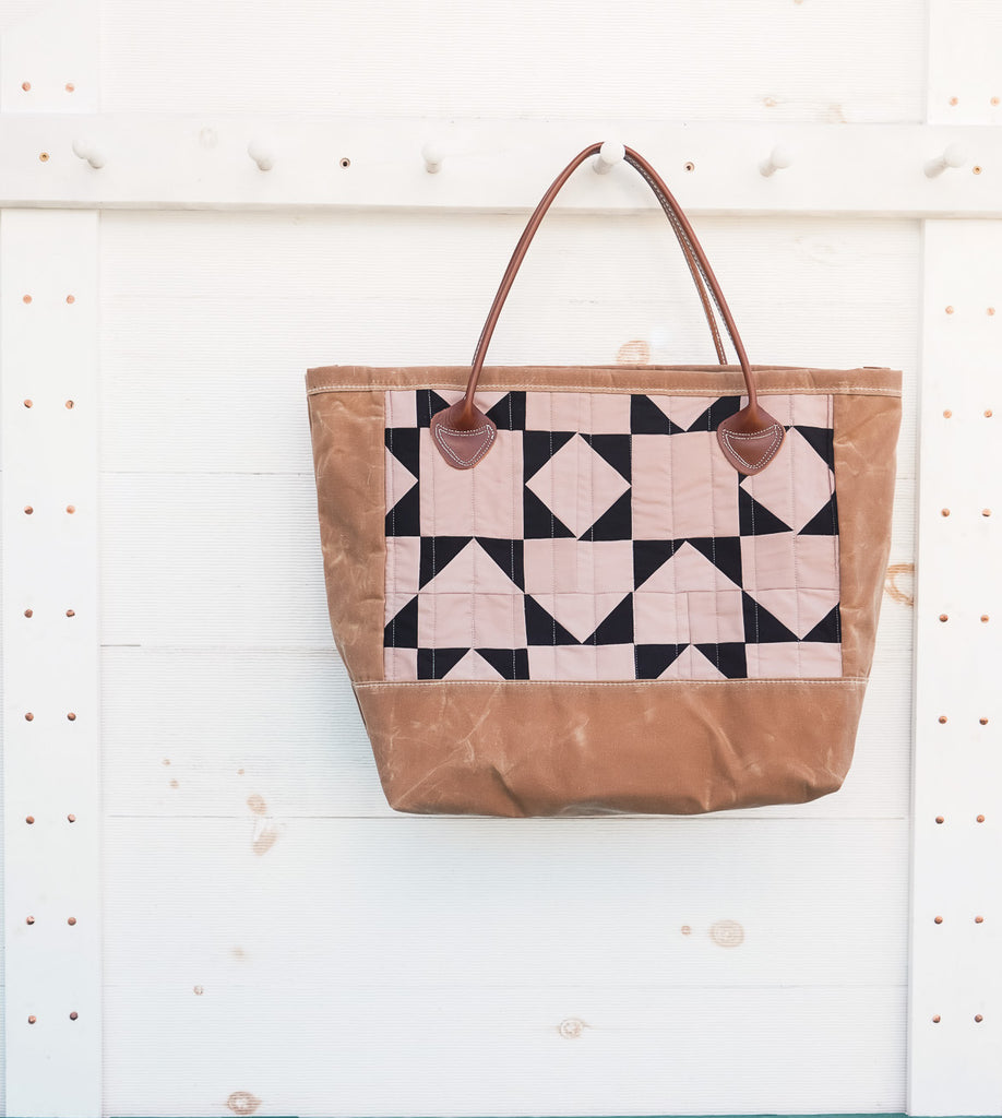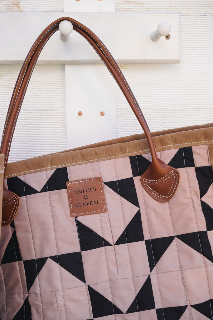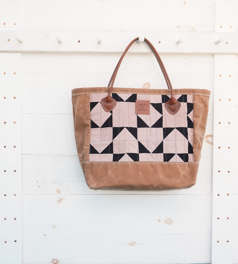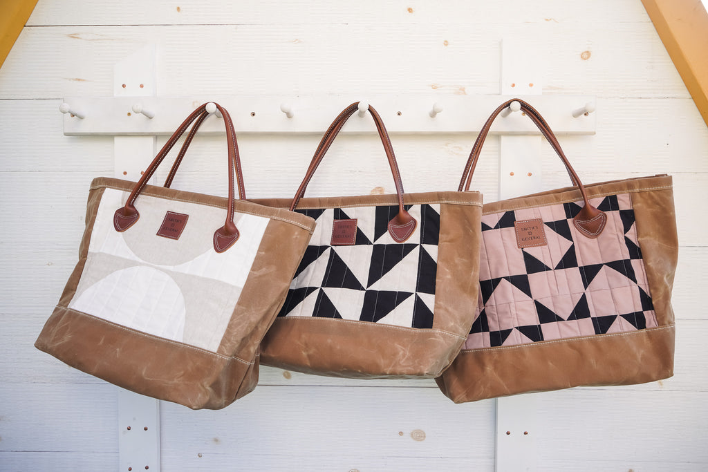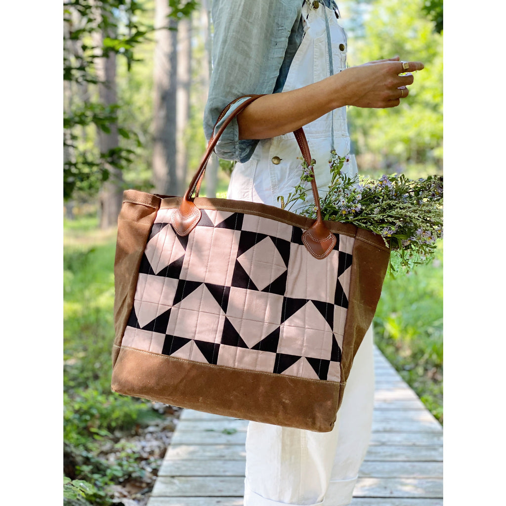 The Quilted Tote Bag was born from a desire to minimize fabric waste in our quilting process while exploring alternate forms and functions of traditional quilts. Each bag panel utilizes remnant fabrics from our 2021 quilt collection.