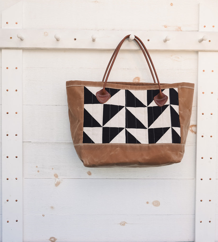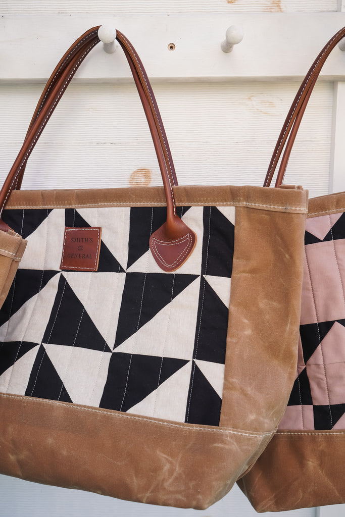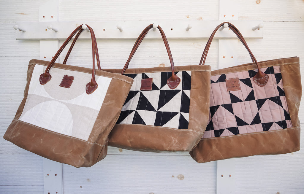 The Quilted Tote Bag was born from a desire to minimize fabric waste in our quilting process while exploring alternate forms and functions of traditional quilts. Each bag panel utilizes remnant fabrics from our 2021 quilt collection.