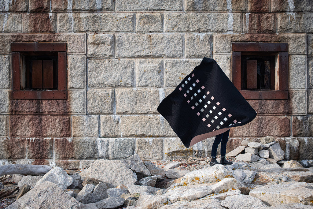 Presiding over the entrance to our most populous harbor is an unassailable stone fort. Built from granite blocks with years of rust pouring down the sides, this monument is synonymous with the coast of Maine. The Gorges quilt displays the geometric patterns of the fort set against the stark sea and moody sky. Congruent and minimalist, Gorges captures the timelessness of this Maine stronghold.