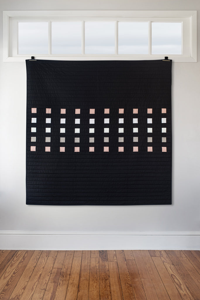 The Gorges Quilt is available with either a black cotton background fabric or a black cotton/linen blend background fabric. The cotton background will have a smoother touch and lighter weight. The cotton/linen blend will have a weightier heft and more textured surface. Both versions are made with additional cotton materials on the front, cotton batting and cotton thread.