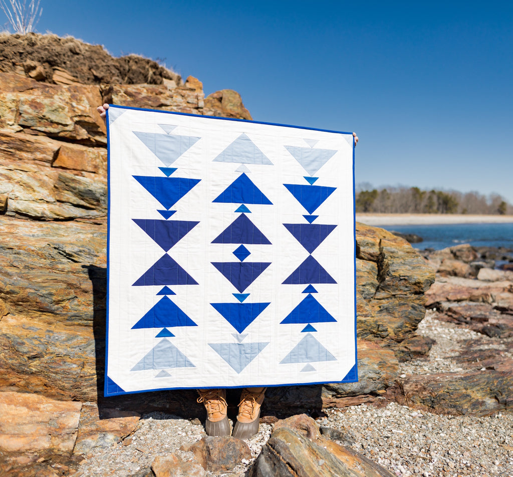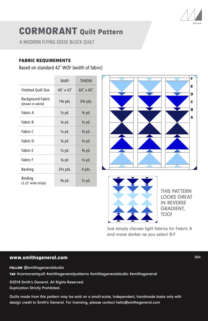 Cormorant is inspired by sea birds diving from high in the air to deep under the sea. This pattern is great for any level quilter who would like to work with a modern flying geese design, gradients and layout play and looks great with a wide array of fabrics.