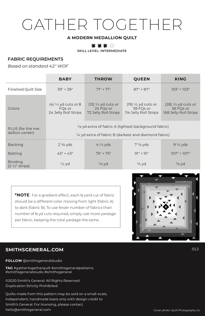 This pattern is for an intermediate quilter. It includes 4 sizes: Baby (39"x39"), Throw (71"x71"), Queen (87"x87") and King (103"x103").