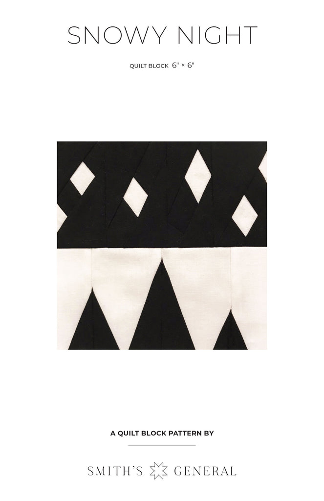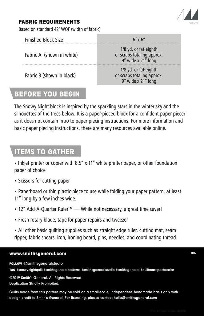 The Snowy Night block is inspired by the sparkling stars in the winter sky and the silhouettes of the trees below. It is a paper-pieced block for a confident paper piecer as it does not contain intro to paper piecing instructions (but it does have tips!). For more information and basic paper piecing instructions, there are many resources available online