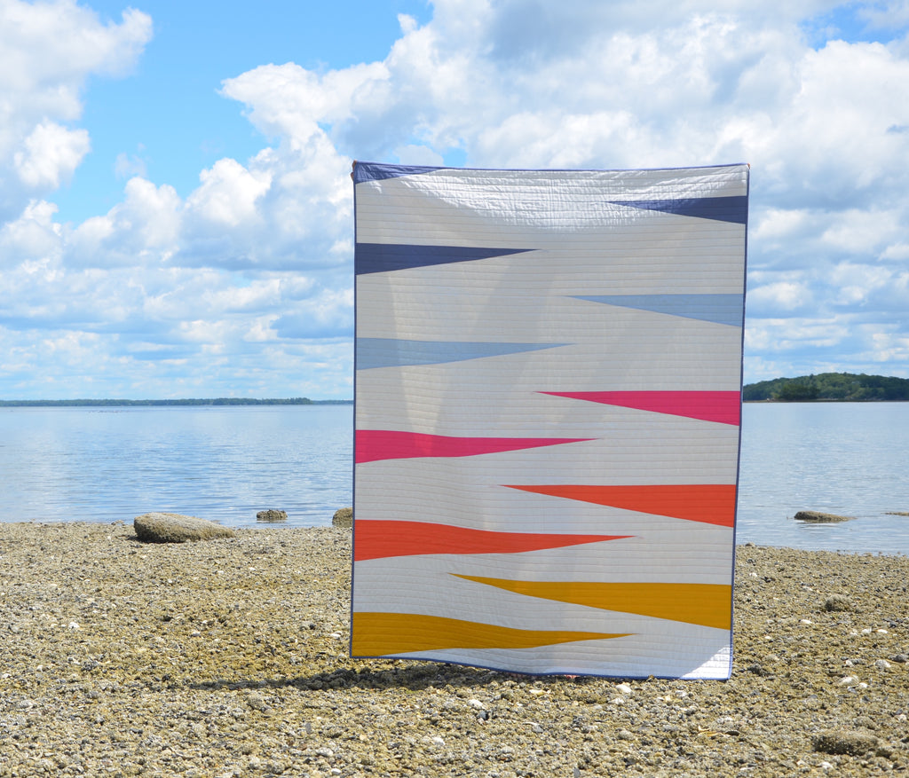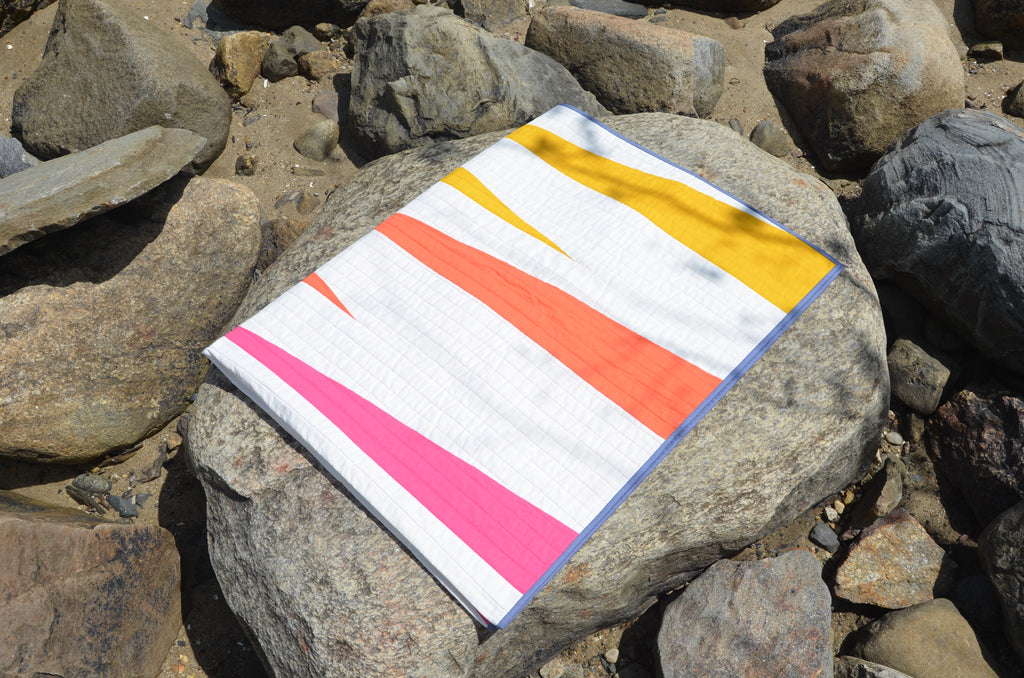 Inspired by the sun slowing sinking beyond the horizon, this modern quilt based off of improv technique emulates the day's end in Maine. With clean lines and bold colors the striking features of this quilt would be equally great as a throw or as a wall hanging.