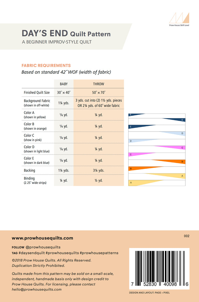 This pattern is great for the beginner to intermediate sewer who would like to work with an improv based technique. Clear and easy instructions makes this pattern doable for even a beginner quilter. Day's End would look great with neutrals, brights, solids or patterned fabrics.